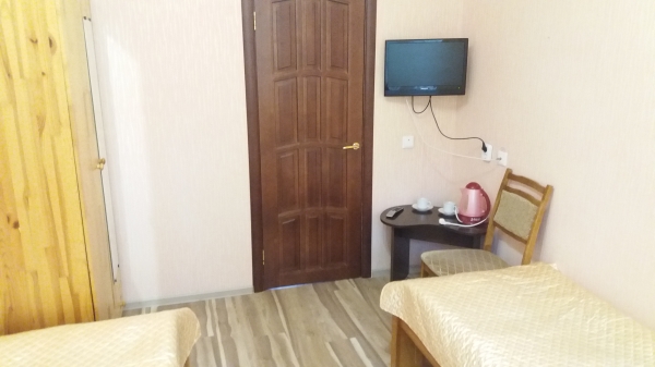 2 осн. места. 1 доп. место. Мебель: вешалка, зеркало, кровати односпальные, прикроватные тумбочки, стол, стулья, шкаф. Оборудование: телевизор, холодильник. Санузел: с душем, туалетные принадлежности. Сервис: смена полотенец, смена постельного белья, уборка номера.