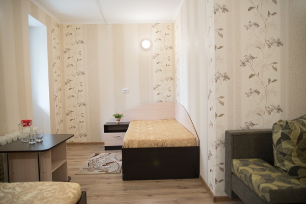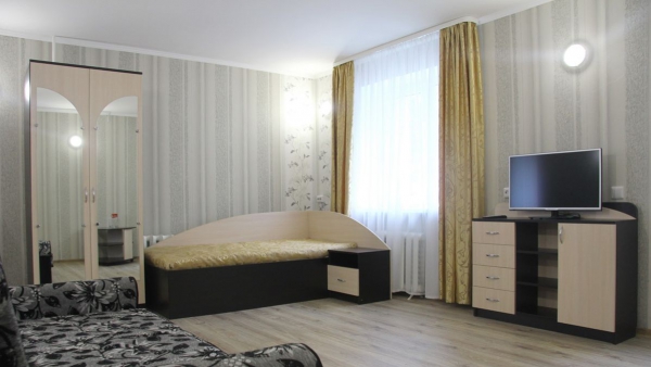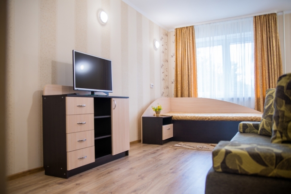 2 осн. места. 2 доп. места. Мебель: вешалка, диван, зеркало, кровати односпальные, прикроватные тумбочки, стол, стулья, шкаф. Оборудование: телевизор, холодильник. Санузел: с душем, туалетные принадлежности. Сервис: смена полотенец, смена постельного белья, уборка номера.